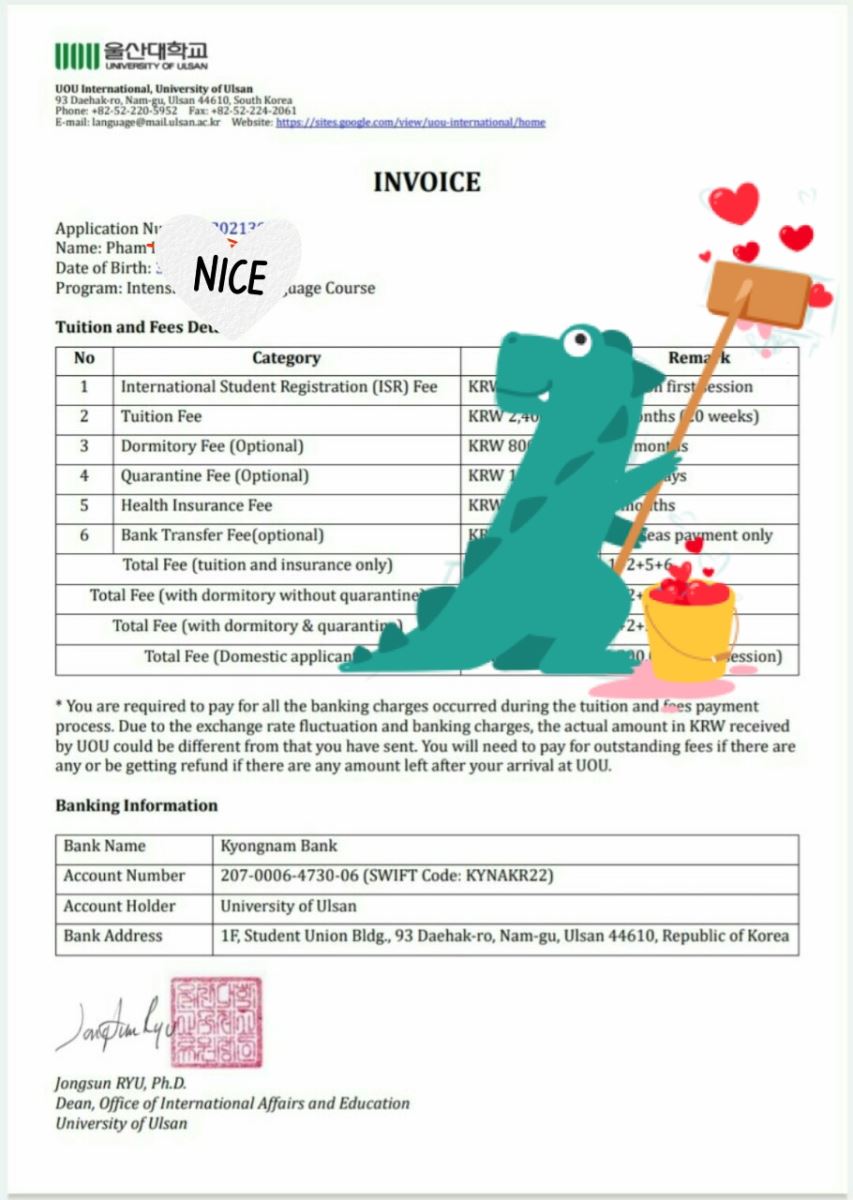 CHÚC MỪNG BẠN PHI HÙNG ĐÃ NHẬN INVOICE TRƯỜNG ĐẠI HỌC ULSAN KỲ THÁNG 9/2021 Thứ tư,04/08/2021 2459 Lượt xem CHÚC MỪNG BẠN PHI HÙNG ĐÃ NHẬN INVOICE TRƯỜNG ĐẠI HỌC ULSAN KỲ THÁNG 9/2021 목적이 그르면 언제든 실패할 것이다,목적이 옳다면 언제든 성공할 것이다 Nếu như sai mục đích bạn sẽ luôn thất bại, nếu như đúng mục đích bạn sẽ luôn thành công. Từ giờ tuy còn rất ít thời gian ở Việt Nam để cho bạn trang bị cho mình kiến thức (như việc học tiếng Hàn chăm chỉ), kỹ năng (như việc tự lập, sắp xếp cuộc sống ), nhưng HANBEE VIỆT bạn thật cố gắng để tháng 9 này, khi đến Hàn Quốc, bạn có thể tự tin, tự lập bước vào đời sống của một Du học sinh một cách trơn tru, thuận lợi. VÀI NÉT TRƯỜNG ĐẠI HỌC ULSAN Đại học Ulsan Hàn Quốc thành lập vào năm 1969. Có trụ sở tại thành phố Ulsan – thành phố lớn thứ 3 tại Hàn Quốc. Đây là thành phố phát triển rất mạnh về công nghiệp và du lịch. Thành phố này cũng là nơi có số lượng người nước ngoài sinh sống nhiều nhất. Bạn sẽ có cơ hội được giao lưu và học hỏi thêm được rất nhiều nền văn hóa khác nhau. Việc học tập tại thành phố này sẽ là một lựa chọn cực kỳ sáng suốt cho các bạn du học sinh. Nhờ sự đầu tư, hỗ trợ rất lớn từ tập đoàn Huyndai và các tập đoàn khác như tập đoàn KCC, bệnh viện Asan Medical Center… Nên cơ sở vật chất cũng như chất lượng đào tạo giảng dạy của trường không ngừng được nâng cao. Cho đến nay, trường đã và đang khẳng định được vị thế của mình trong hệ thống giáo dục của Hàn Quốc bằng những thành tựu đáng nể. Top 100 trường đại học hàng đầu Châu Á. Chất lượng đào tạo của trường ngày càng được khẳng định qua các thế hệ sinh viên ra trường thành đạt. Đứng thứ 18 trong top các trường đại học chất lượng và uy tín nhất Hàn Quốc. Hiện nay trường có 16.000 sinh viên theo học. Trong đó có gần 1000 sinh viên quốc tế đến từ 35 quốc gia trên thế giới. Lựa chọn du học tại đây bạn sẽ có rất nhiều cơ hội đầu quân cho các tập đoàn lớn như: Huyndai, LG, SK… khi kết thúc quá trình học tập. Ngoài ra trường còn có rất nhiều chính sách học bổng cho du học sinh quốc tế. Mà học chi phí học tập lại phải chăng. DU HỌC HÀN QUỐC HANBEE VIỆT - ĐÀ NẴNG LIÊN HỆ TƯ VẤN: 0901.131.029 ĐỊA CHỈ: 20 Ỷ LAN NGUYÊN PHI, HẢI CHÂU, ĐÀ NẴNG